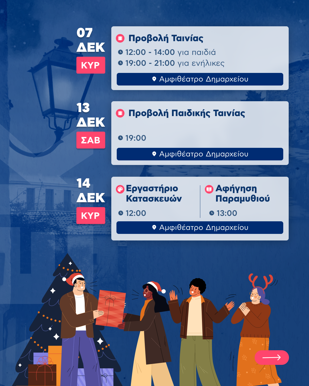 Με προβολές ταινιών, εργαστήρια, δημιουργικές δράσεις, bazaar, θεατρική παράσταση και χριστουγεννιάτικο party, το νησί μας μπαίνει σε εορταστικό κλίμα με χαρά και συμμετοχή της κοινότητας.
