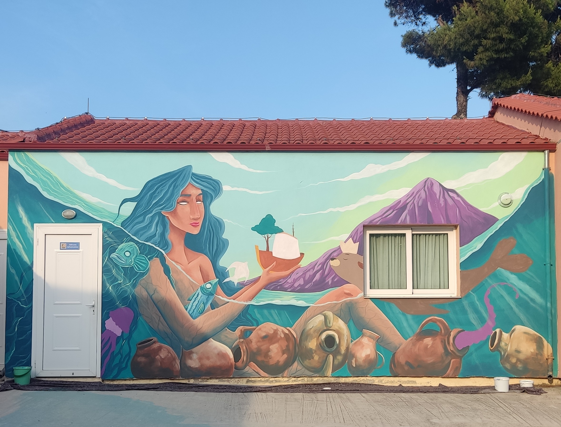 Μια τοιχογραφία, που μεταφέρει μηνύματα οικολογίας, αρμονίας και πολιτιστικής μνήμης. Συνδυάζοντας μυθικά και σύγχρονα στοιχεία, όπως η φώκια της Αλοννήσου και η θαλάσσια θεά, αφηγείται την ιστορία του νησιού στα παιδιά του μέλλοντος. - Aetas (Micol Cornali | παραλία Γλυφά)