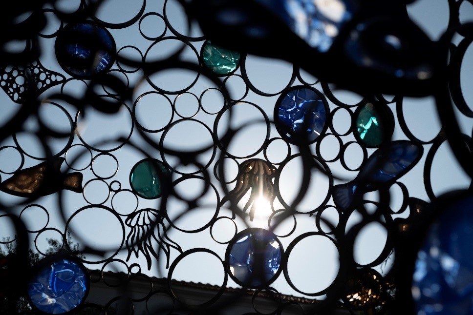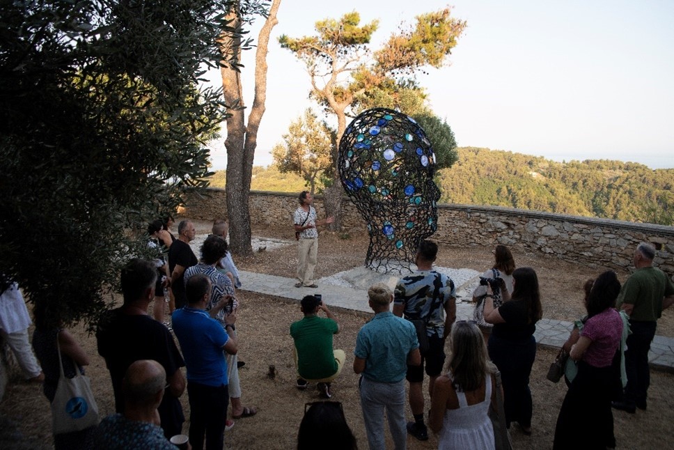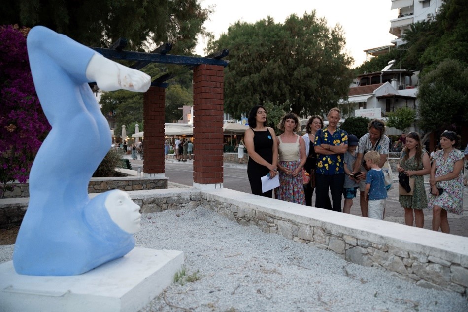Στη συνέχεια, οι επισκέπτες μετακινήθηκαν μπροστά από το Δημαρχείο για την παρουσίαση του γλυπτού “Aetas” της Micol Cornali, το οποίο συμβολίζει την αναγέννηση και την επανασύνδεση με το θαλάσσιο περιβάλλον μεταφέροντας ένα μήνυμα ελπίδας και μεταμόρφωσης. Το έργο θα τοποθετηθεί υποβρυχίως, κοντά στην παραλία Γλυφά, ως τεχνητός ύφαλος, προσφέροντας νέα ζωή στον θαλάσσιο βυθό.