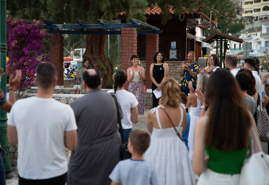Η βραδιά κορυφώθηκε στο λιμάνι του Πατητηρίου, με την παρουσίαση του γλυπτού “Blue Diver” της Anna Torre. Το μαρμάρινο έργο απεικονίζει έναν δύτη, εξερευνητή της υποθαλάσσιας ζωής, και συνδέει την παρατήρηση της φύσης με την προστασία της. Η ημέρα έκλεισε με κρασί, φιλική συζήτηση και θαλασσινή αύρα, δημιουργώντας ένα αίσθημα κοινότητας και σύνδεσης μέσα από την τέχνη.