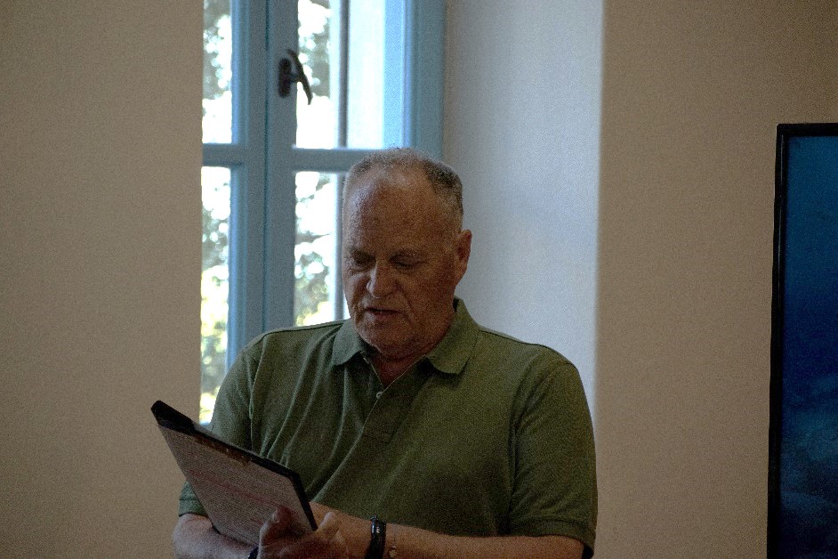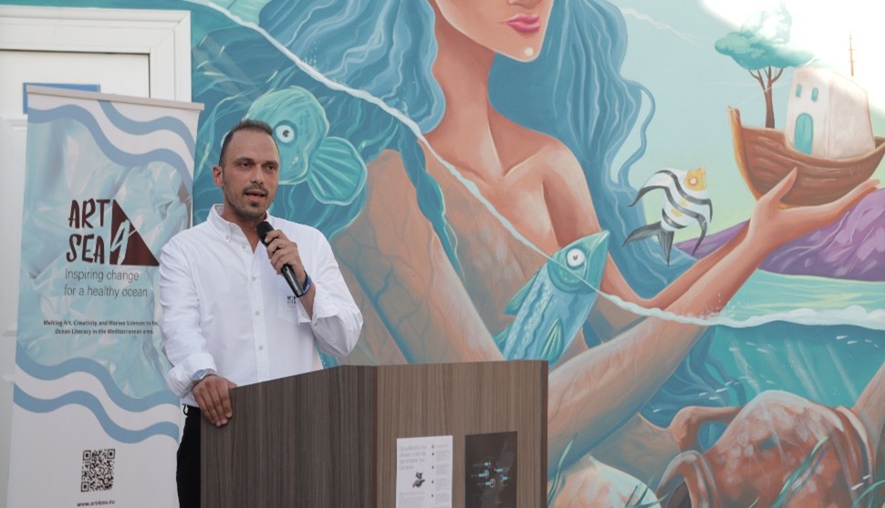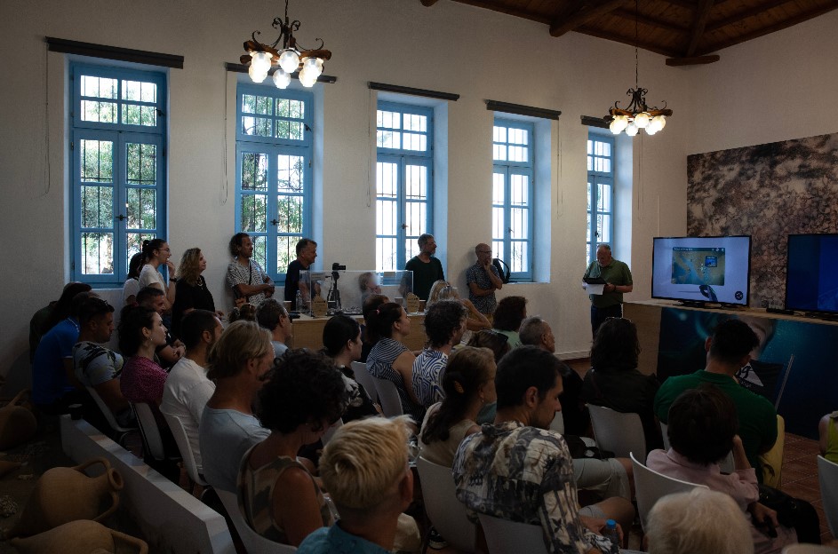 Την εκδήλωση άνοιξε η κ. Βίκυ Δρούγα, από την Ατλαντίς Συμβουλευτική, υπεύθυνη υλοποίησης του έργου ART4SEA, η οποία παρουσίασε το έργο, δίνοντας έμφαση στη σημασία του για την Αλόννησο. Στη συνέχεια, χαιρετισμό απηύθυνε ο κ. Αλέξανδρος Αναγνώστου, Αντιδήμαρχος Πολιτισμού, Αθλητισμού, Παιδείας και Τουρισμού του Δήμου Αλοννήσου, ο οποίος εξήρε τη σημασία της φιλοξενίας ενός ευρωπαϊκού έργου τέχνης σε έναν τόπο που προστατεύει έμπρακτα το θαλάσσιο περιβάλλον και τόνισε τη σύνδεση του έργου με τις τοπικές κοινωνίες και την ανάδειξη της πολιτιστικής κληρονομιάς. Ακολούθησε η ανάγνωση χαιρετισμού από τη Βουλευτή Ν. Μαγνησίας κ. Ζέττα Μακρή, η οποία, αν και δεν παρευρέθηκε αυτοπροσώπως, απέστειλε θερμό μήνυμα στήριξης. Στη συνέχεια, ο κ. Σπυρίδων Τάκος, Διευθυντής του Δημοτικού Σχολείου Αλοννήσου, αναφέρθηκε στον παιδαγωγικό αντίκτυπο της έκθεσης, ιδιαίτερα με αφορμή την ενσωμάτωση της τοιχογραφίας στον σχολικό χώρο. Στο βήμα ανέβηκε στη συνέχεια ο κ. Fabio Bruno, Διευθυντής της 3D Research και συντονιστής του έργου ART4SEA, ο οποίος παρουσίασε τον ευρωπαϊκό χαρακτήρα του προγράμματος, τη συνεργασία διαφορετικών επιστημονικών και καλλιτεχνικών φορέων και τη σημασία των θαλάσσιων πολιτιστικών τοπίων στη βιώσιμη ανάπτυξη των νησιών. Ο κ. Lucenzo Tambuzzo, καλλιτεχνικός διευθυντής του έργου από την iWorld, μίλησε για την επιμέλεια των έργων και τη διαδικασία μέσω της οποίας οι καλλιτέχνες βίωσαν τη σχέση τους με το νησί, μετατρέποντας τη φυσική εμπειρία σε εικαστική δημιουργία.