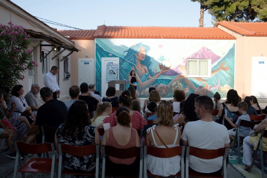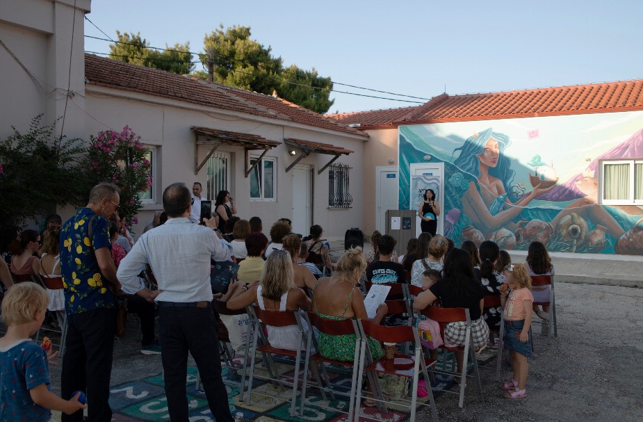 Ακολούθησε η παρουσίαση της τοιχογραφίας “Life Synchrony” της Rame13 στον προαύλιο χώρο του Δημοτικού Σχολείου. Το έργο απεικονίζει τη θάλασσα ως πηγή ζωής και συμβολικό «σπίτι» με φωτεινά χρώματα και παραστατικά στοιχεία που απευθύνονται ιδιαίτερα στα παιδιά. Η τοιχογραφία έχει στόχο να ενισχύσει τη σύνδεση των μαθητών με τη φύση και να προωθήσει την περιβαλλοντική συνείδηση μέσα από την καθημερινότητα του σχολείου.